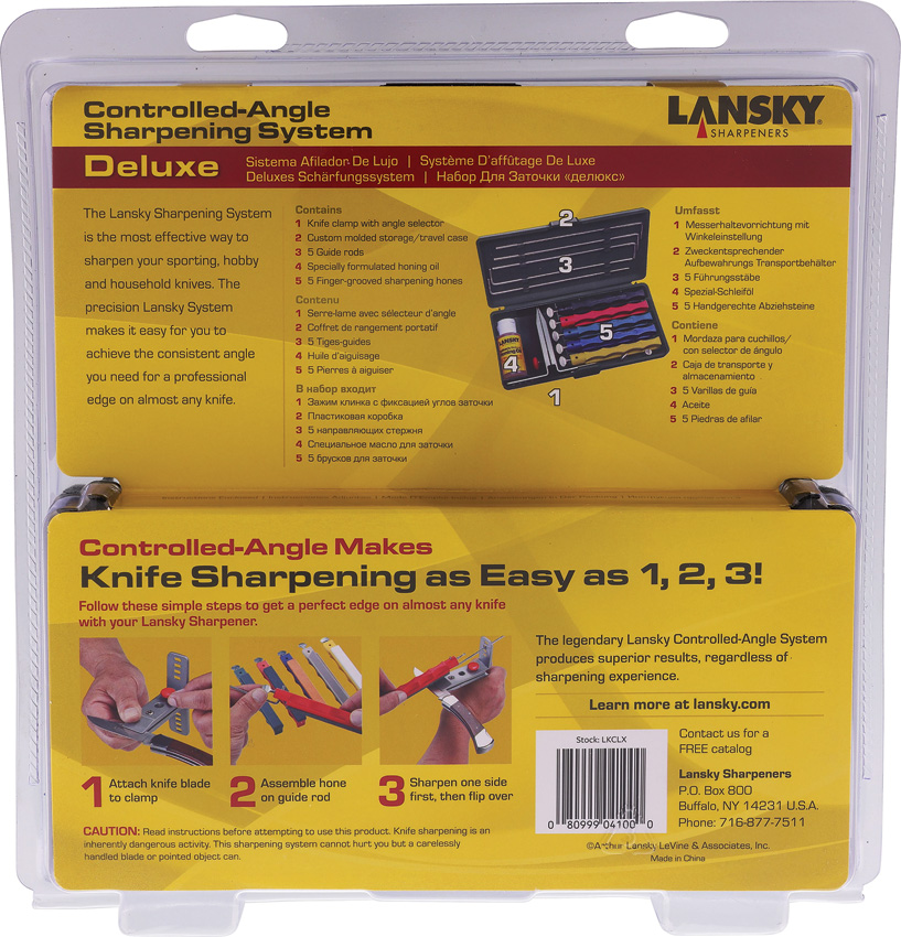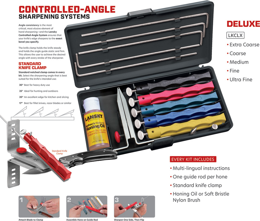 Includes extra coarse; coarse; medium; fine and ultra fine hones. Each sharpening system comes with precision multi-angle; flip-over knife clamp; sharpening hones on color coded finger grooved safety holders; one guide rod for each stone; specially formulated honing oil and screws. Custom molded storage/carrying case with dimensions 8.5″ x 4.25″ x 1″. Includes easy to follow instructions. Previously advertised as item# LS2. Clam packed.
