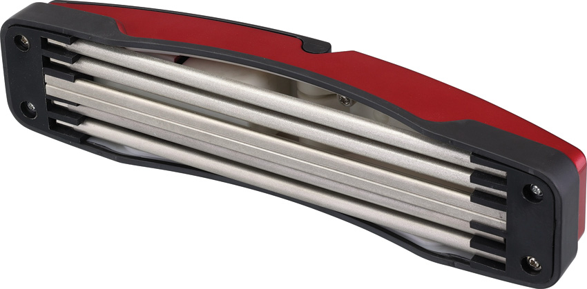 Dimensions: 10.75″ x 2.5″ x 2″. Grit: Medium l Fine. Non-slip base. Three preset rod angles (17, 20, 25). Medium (400 grit) and fine (600 grit) diamond rods. 3-radius diamond triangular rod which will sharpen all types of serrations as well as awls and fish hooks. Integrated hand guard. Easy snap-in rod storage. Each rod measures 9″. Assembled dimensions: 10.75″ x 9.5″ x 2″. Boxed with hanging tab.