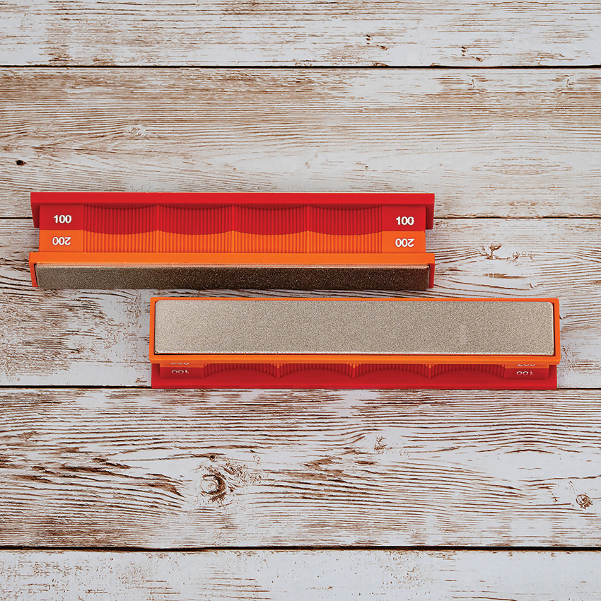 Two premium monocrystalline 100 grit (red) and 200 grit (orange) diamond stones. Boxed.
