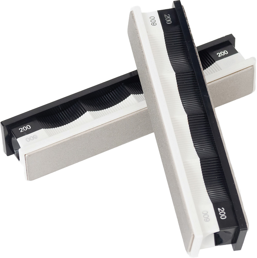 Two premium monocrystalline 200 grit (black) and 600 grit (white) diamond stones. Boxed.