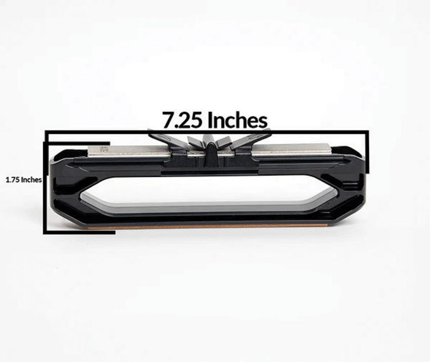 Dimensions: 7.25″ x 1.75″. Patent-pending angled knife guide ensures a consistent sharpening angle of 20 degrees. Dual-sided sharpening with a 500-grit diamond stone and ceramic hone. Reversible stone design. Lightweight and rugged, only 4 oz. Ergonomic handle. Leather strop included. Knife guide stores safely in the handle for convenience on the go. Boxed.