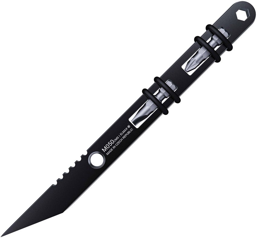 6.88″ (17.48cm) overall. 1.5″ (3.81cm) black DLC coated Elmax steel blade. One-piece construction. The end of the handle features a hexagonal opening for operating the standard 0.25″ hex bit. Comes with a MOLLE sheath clip and two hex bits in its handle. Black Kydex sheath. Boxed.