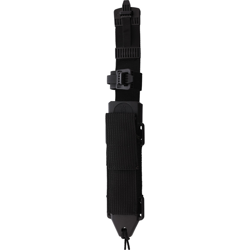 12.25″ (31.12cm) overall. 6.5″ (16.51cm) black oxide coated sawback stainless blunt tip blade. Black aluminum hollow handle with survival kit. The kit includes: fishing kit, sewing kit, scalpel, dressings, tweezers, compass, latex tube. Black polyamide belt sheath. Boxed.