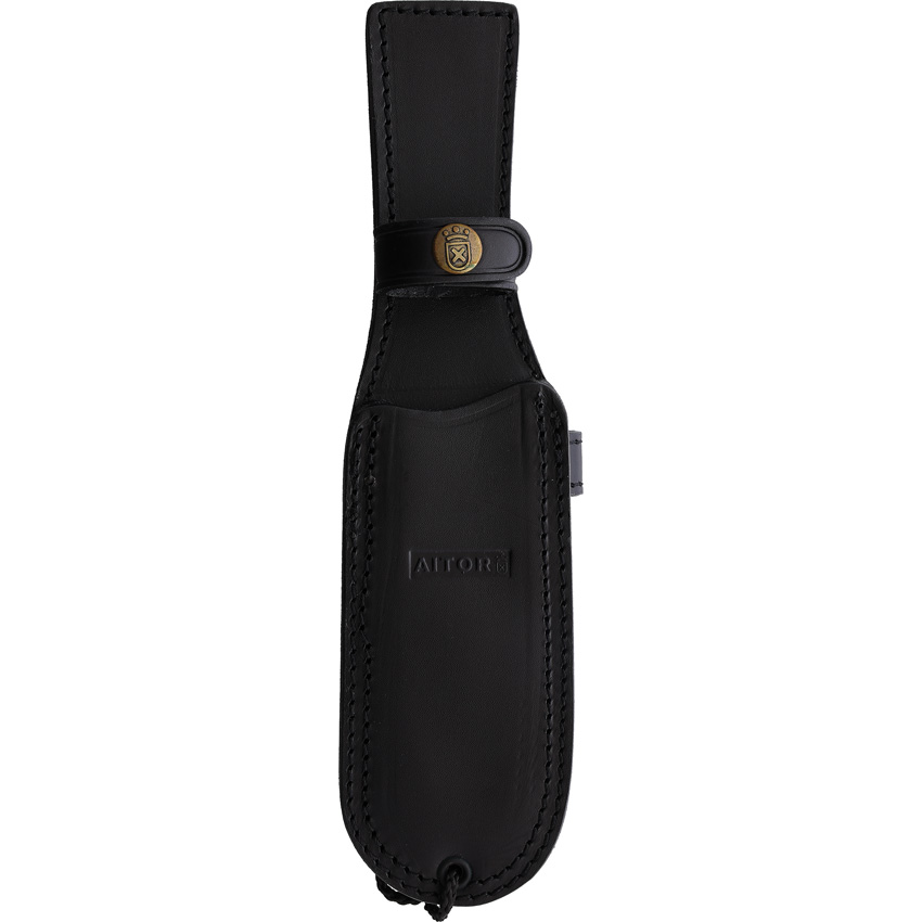 9.25″ (23.5cm) overall. 4.5″ (11.43cm) satin finish stainless blade. Black wood handle. Full, extended tang. Lanyard hole. Black leather belt sheath. Boxed.