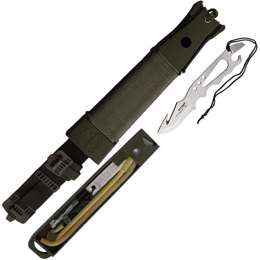 14.25″ (36.2cm) overall. 8″ (20.32cm) black powder coated sawback stainless clip point blade. Black knurled stainless handle. O-ring sealed stainless pommel unscrews to reveal a compass inside cap and small survival kit stored in clear acrylic tube in handle. OD green hard nylon belt sheath with leg ties. Stores a 7″ overall skinner with 2.5″ guthook blade. One piece stainless construction with integrated flathead screwdriver and bottle/can opener. Also stored inside sheath is a pullout tray with latex bands for slingshot, empty vial and sharpening stone. Back of tray features ruler, S. O. S. Signals and signaling mirror. Outside of sheath has several feet of OD green nylon cord and black coated stainless metal arms at tip of sheath that flip out to serve as slingshot. Back of sheath has a sharpening stone. Boxed.