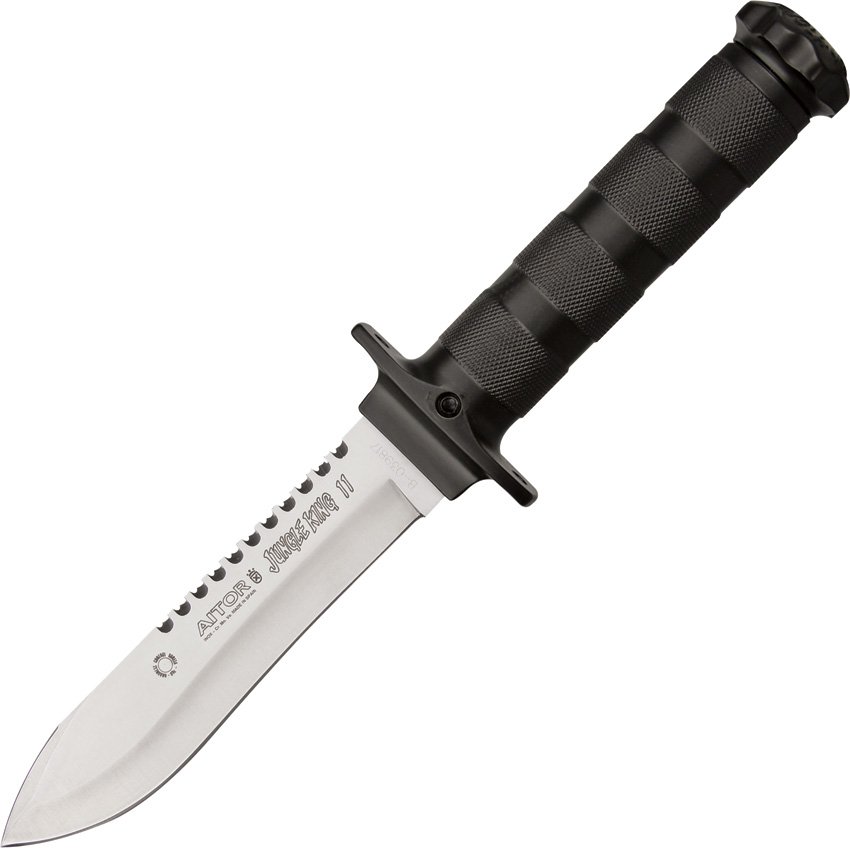 10 3/4″ overall. 5 3/8″ stainless spear blade with double cut sawback. Knurled black stainless handle. Black stainless guard with lashing holes. Black stainless pommel unscrews to reveal a compass inside cap and small survival kit stored in clear acrylic tube in handle. O-ring sealed. OD green hard nylon belt sheath with leg ties. Sheath also stores a 4 7/8″ overall skinner with 1 3/8″ guthook blade. One piece stainless construction. Skinner features thumb ridge, ridged handle slot, lashing holes, flathead screwdriver end with bottle/can opener, and OD green nylon lanyard. Also stored inside sheath is a pullout tray with latex powerbands for slingshot. Back of tray features ruler, S.O.S. signals and signaling mirror. Outside of sheath features several feet of OD green nylon cord, black coated stainless metal arms at tip of sheath that flip out to serve as slingshot, and a sharpening stone on the back.