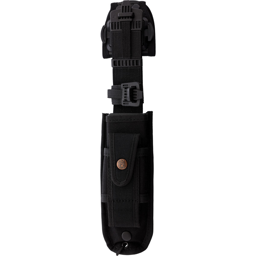 10.75″ (27.31cm) overall. 5.75″ (14.61cm) black coated stainless clip point blade. Black wood handle. Full, extended tang. Lanyard hole. Black Cordura belt sheath. Boxed.