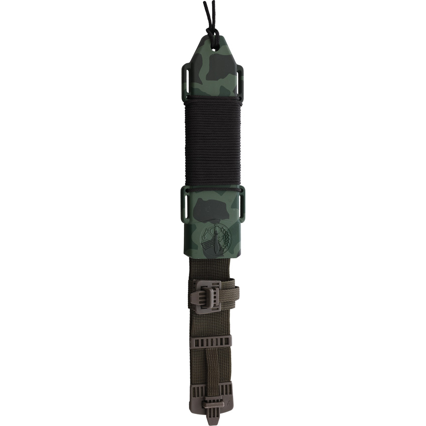 12.13″ (30.81cm) overall. 7.25″ (18.42cm) black powder coated sawback stainless clip point blade. Camo textured polymer handle. Stainless guard. Lanyard hole. Camo nylon belt sheath. Boxed.