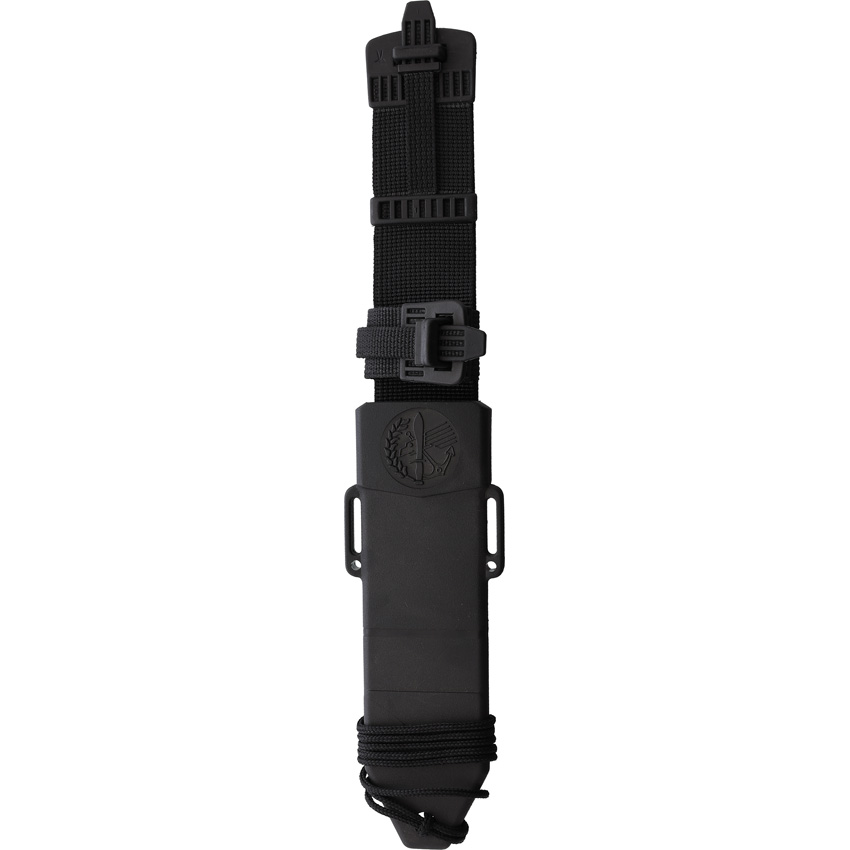 10.25″ (26.04cm) overall. 5.75″ (14.61cm) black coated partially serrated stainless blade. Black wood handle. Lanyard hole. Full, extended tang. Black composite belt sheath. Boxed.