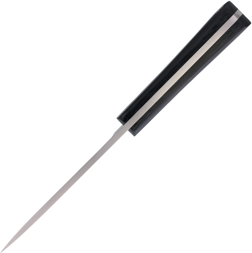 7.88″ (20.02cm) overall. 4″ (10.16cm) satin finish A2 tool steel drop point blade. Black canvas micarta handle. Full tang. Lanyard hole. Brown leather belt sheath. Boxed.