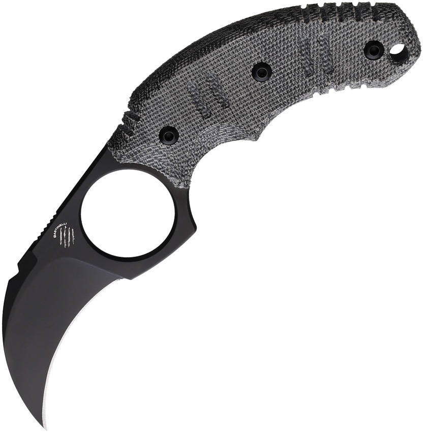 6.13″ (15.57cm) overall. 2″ (5.08cm) black PVD coated Bohler M390 stainless hawkbill blade. Black canvas micarta handle. Finger ring. Full tang. Lanyard hole. Black and red Kydex belt sheath with UltiClip. Boxed.