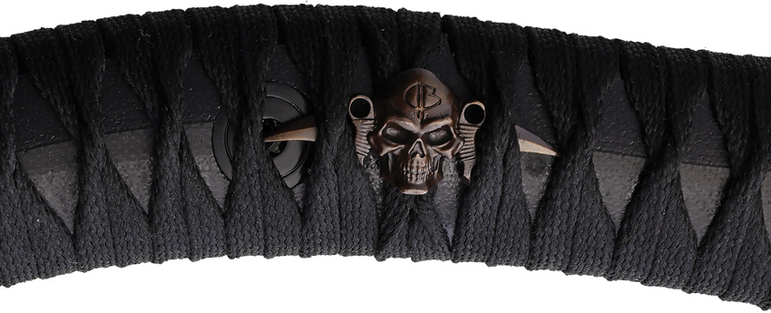 10.5″ overall. 6.5″ black Cerakote finish Bohler N690 stainless axe head with 4.5″ cutting edge. Black smooth G10 handle. Full, extended tang. Lanyard hole. Black tsukamaki wrapped handle with skull emblem. Black leather belt sheath. Zippered storage case.