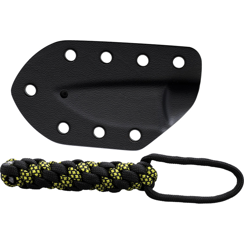 5.5″ (13.97cm) overall. 2.5″ (6.35cm) satin finish RWL-34 steel blade. Mustard yellow micarta handle. Full tang. Lanyard hole. Flat grind blade. Braided paracord lanyard. Black Kydex sheath. Boxed.