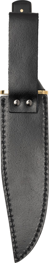 12″ (30.48cm) overall. 7.5″ (19.05cm) black stonewash finish stainless bowie blade. Ebony wood handle. Brass guard. Full tang. Inlay shield. Black leather belt sheath. Boxed.