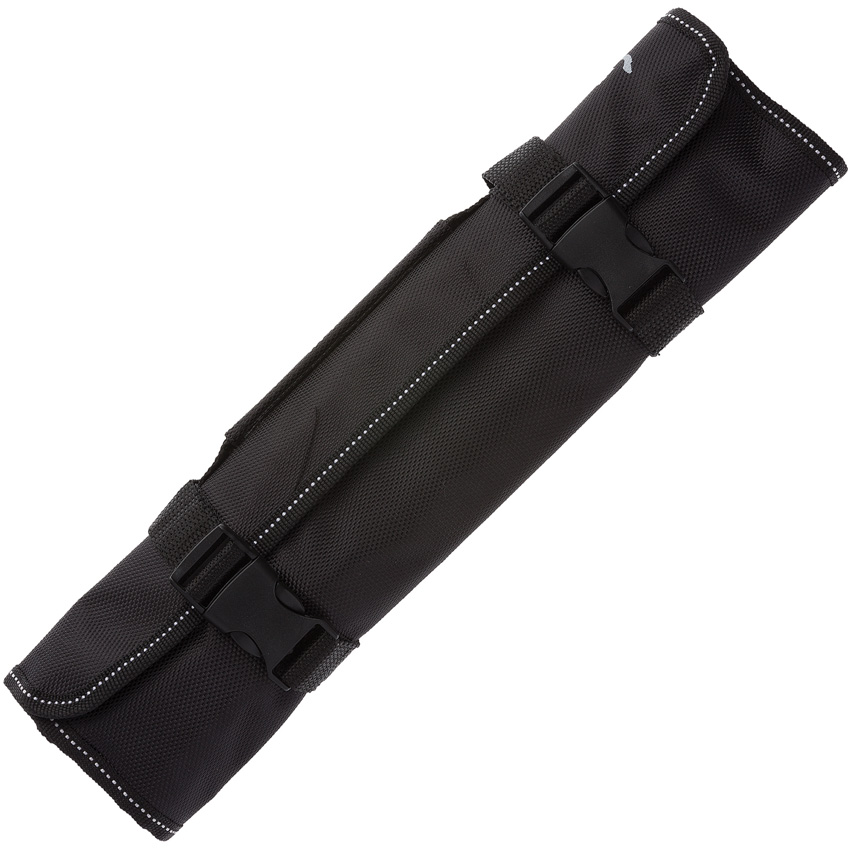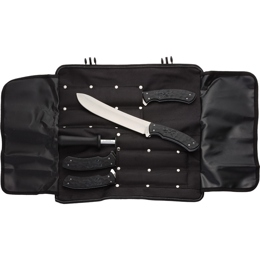 Satin finish 8Cr13MoV stainless blade. Black rubberized polymer handle. Includes: 12.5″ overall butcher with 7.5″ blade; 10″ overall trimming with 5″ blade; 11″ overall fillet with 6″ blade; 11″ overall deboning with 6″ blade, Sharpening rod. Black nylon storage case. Boxed.