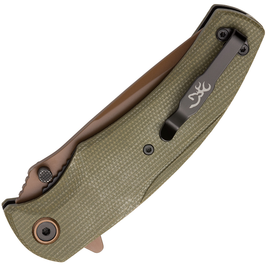 4.5″ (11.43cm) closed. 3.5″ (8.89cm) bronze titanium coated D2 tool steel blade. Green laminated micarta handle. Extended tang. Thumb stud. Pocket clip. Clam packed.