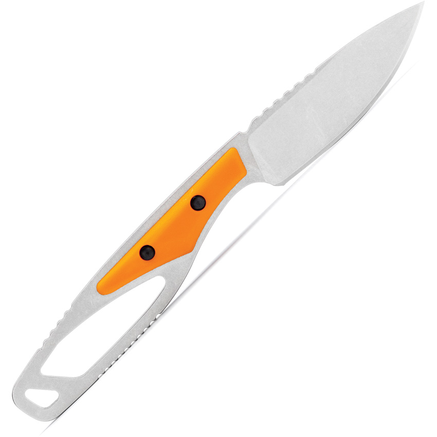 7″ (17.78cm) overall. 2.75″ (6.99cm) stonewash finish 420HC stainless caping blade. Orange glass filled nylon handle. Full tang. Lanyard hole. Black polypropylene belt sheath. Boxed.