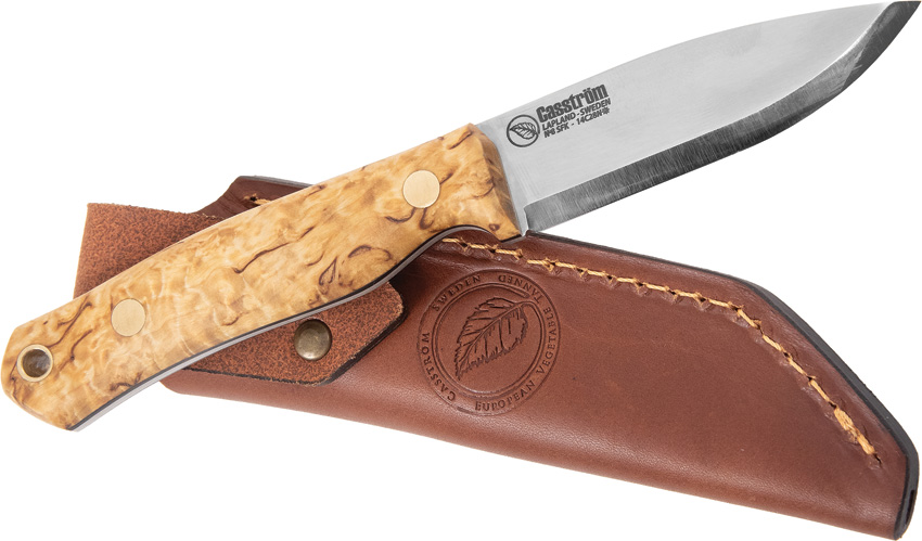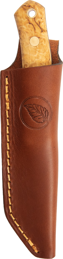 7.5″ (19.05cm) overall. 3.25″ (8.26cm) satin finish Scandi grind 14C28N Sandvik stainless blade. Curly Birch handle. Full tang. Lanyard hole. Brown leather belt sheath. Boxed.