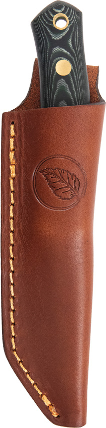 7.5″ (19.05cm) overall. 3.25″ (8.26cm) Scandi grind 14C28N Sandvik stainless blade. Green micarta handle. Full tang. Lanyard hole. Brown leather belt sheath. Boxed.