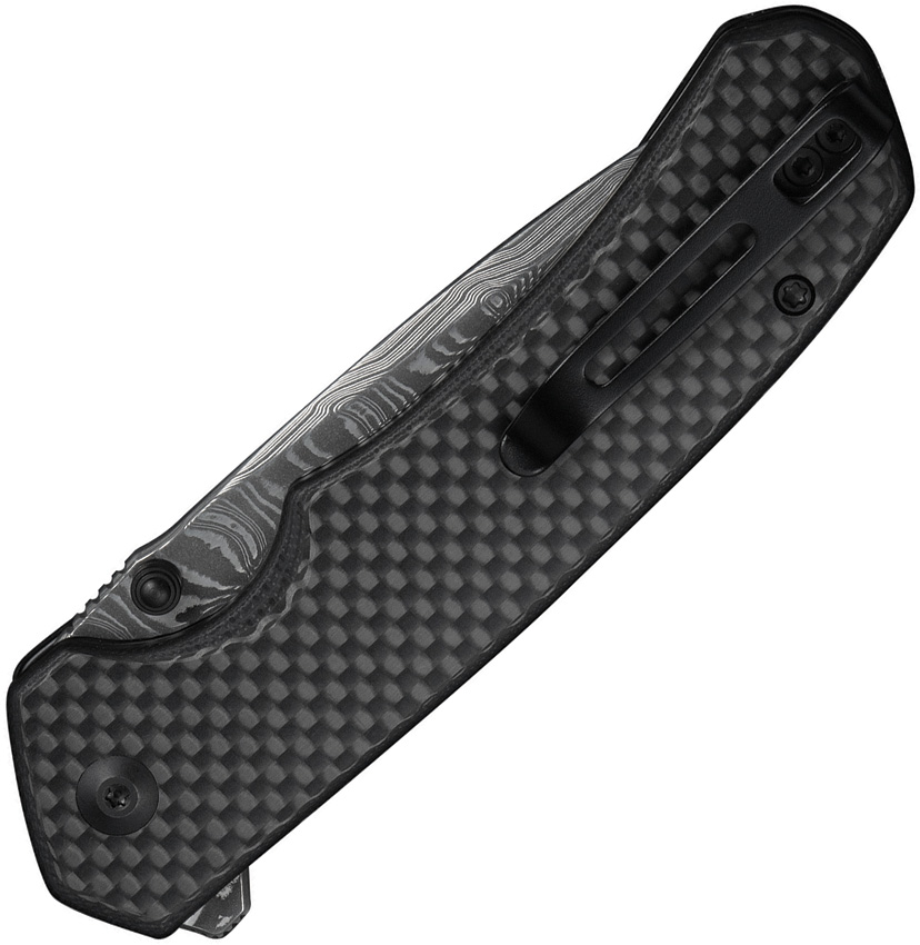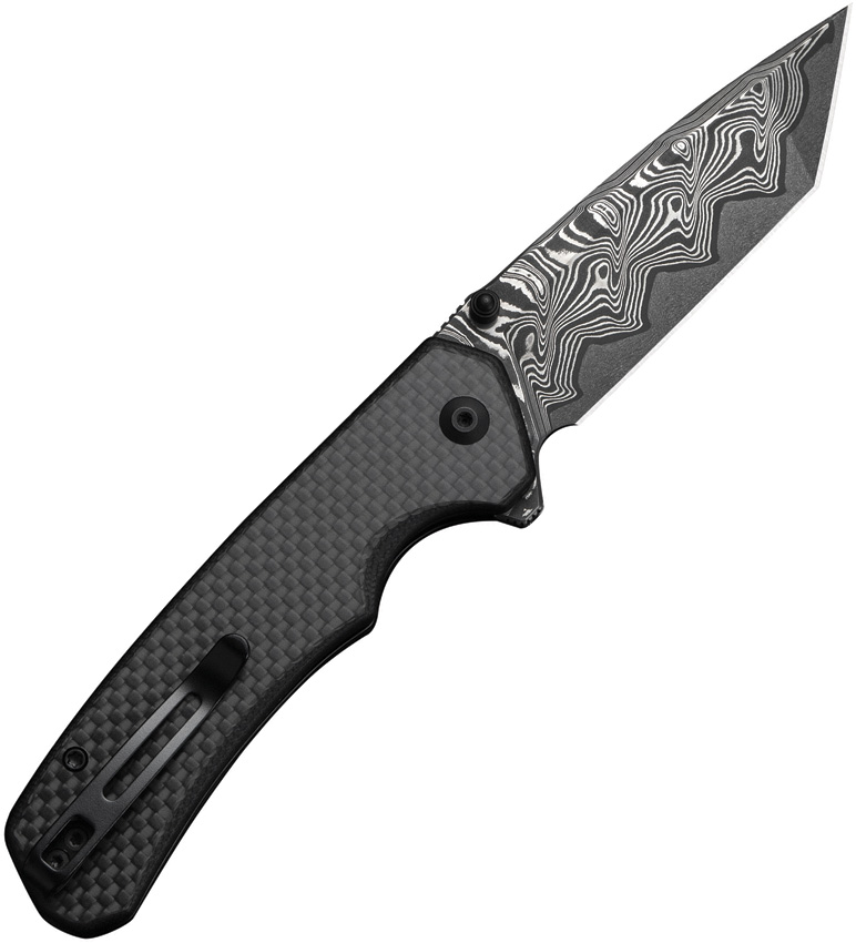 4.5″ (11.43cm) closed. 3.5″ (8.89cm) Damascus steel tanto blade. Black G10 handle with carbon fiber onlay. Thumb stud. Extended tang. Pocket clip. Black nylon zippered storage case. Boxed.