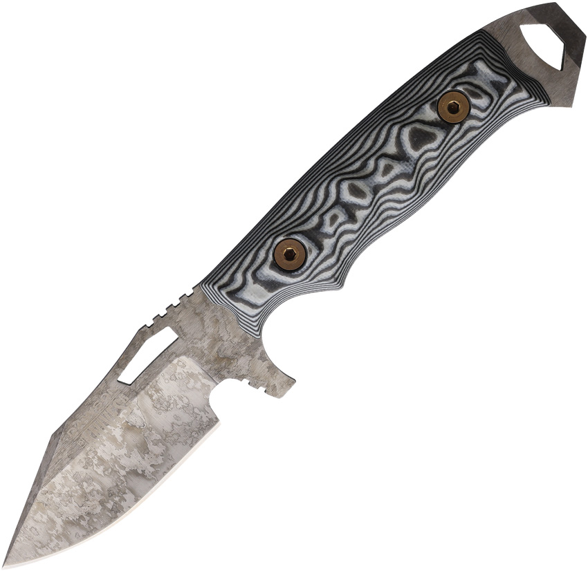 8″ (20.32cm) overall. 3.5″ (8.89cm) Monsoon finish CPM MagnaCut stainless blade. Black and white sculpted G10 handle. Full, extended tang. Lanyard hole. Black Kydex belt sheath. Boxed.