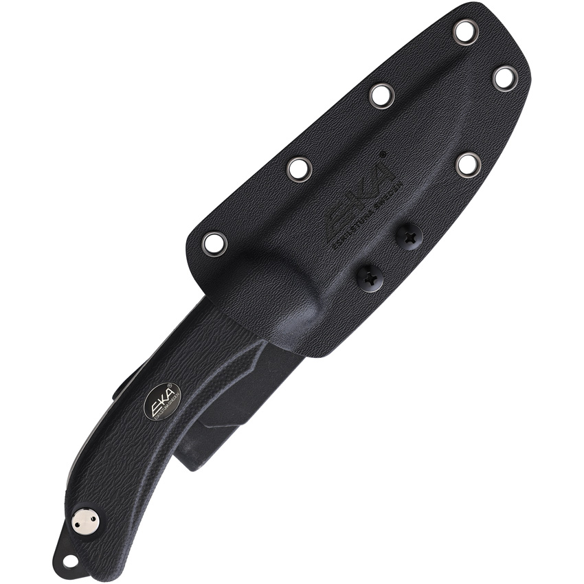 8.75″ (22.23cm) overall. Satin finish 12C27 Sandvik stainless blade. Black rubber handle. Lanyard hole. Push button to switch between utility blade and gut blade. Black molded plastic belt sheath. Boxed.