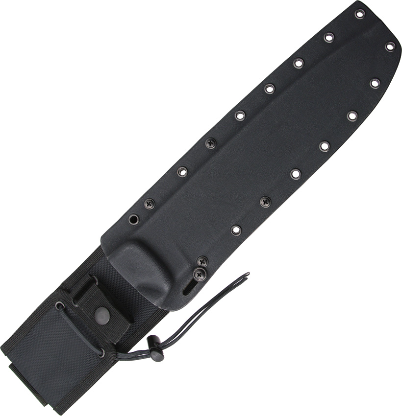 16.5″ overall. 10.38″ dark earth powder coated 1095HC steel blade. OD green canvas micarta handle. Full, extended tang. Lanyard hole. Blade with Rowen tang stamp. Hammer pommel. Black Kydex sheath with clip plate attachment and nylon MOLLE compatible belt sheath. Bulk packed.