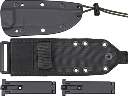 9″ overall. 4.5″ desert tan powder coated partially serrated 1095HC steel blade. OD green micarta handle. Full, extended tang. Lanyard hole. Black molded plastic sheath with clip plate attachment and nylon MOLLE compatible belt sheath.