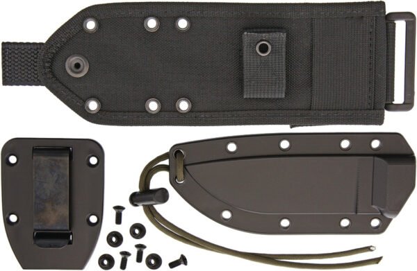 9″ overall. 4.5″ black powder coated partially serrated 440C stainless blade. Black micarta handle. Lanyard hole. Full, extended tang. Black molded plastic sheath with clip plate attachment and nylon MOLLE compatible belt sheath.