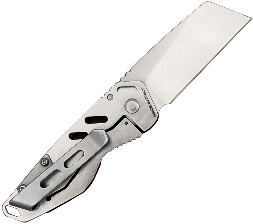 3″ (7.62cm) closed. 2″ (5.08cm) satin finish Bohler N690 stainless sheepsfoot blade. Cherry anodized aluminum handle with Satin stainless back handle. Lanyard hole. Pocket clip. Boxed.