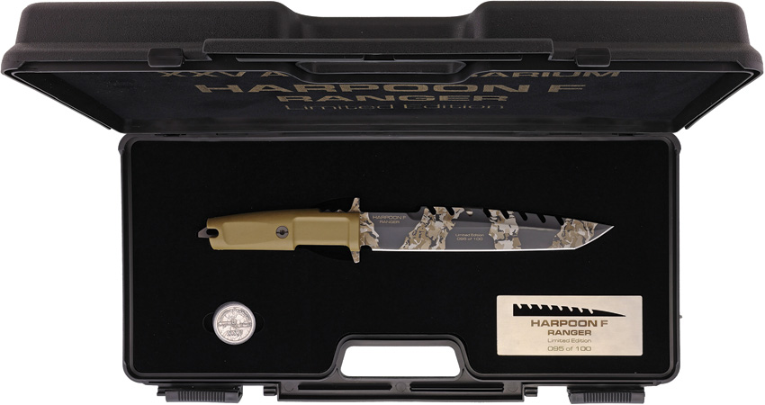 13.5″ (34.29cm) overall. 8.25″ (20.96cm) MIL-C-13924 burnished sawback Bohler N690 stainless modified spear point blade. Hybrid Coyote Sage Forprene handle. Full, extended tang. Lanyard hole. Geotech Camo and black blade. Serialized limited edition of 100. Comes in a weather, dust and shock resistant polypropylene case with pressurization valve; this includes a commemorative coin of the twenty-fifth anniversary of Extrema Ratio and a metal plate bearing the progressive number within the limited series. Tan Cordura belt sheath. Boxed.