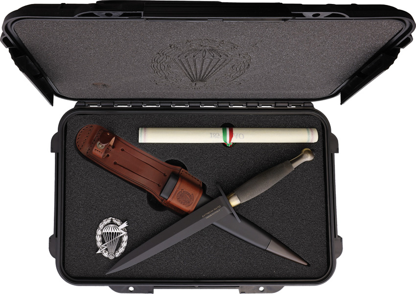 11.38″ (28.91cm) overall. 6.5″ (16.51cm) black MIL-C-13924 burnished double edge Bohler N690 stainless dagger blade. Brass handle. Steel guard. Includes: Historical frieze of the Squadron F, Leather and Kydex sheath with brass point, and two commemorative scrolls. Hardside carrying case.