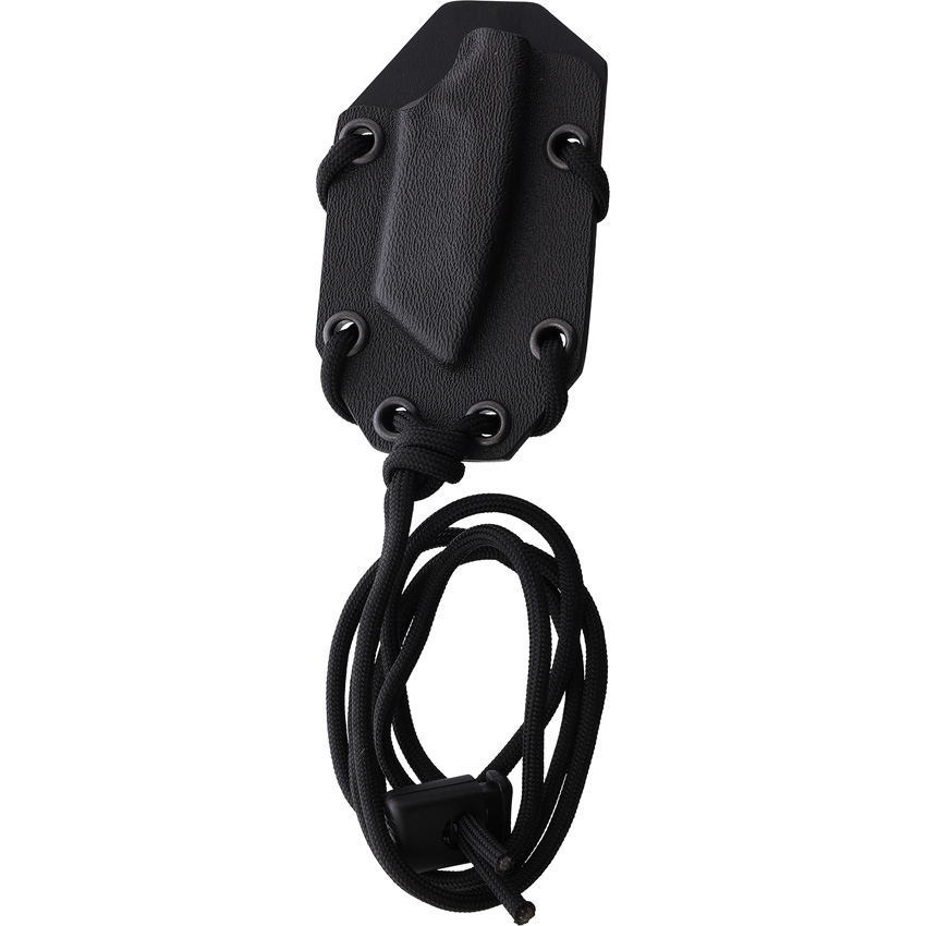 5″ (12.7cm) overall. 2″ (5.08cm) black oxide coated Bohler N690 stainless tanto blade. One-piece construction. Lanyard hole. Black Kydex neck sheath. Boxed.
