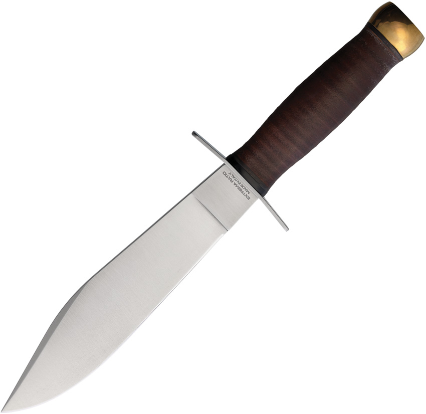 11.5″ (29.21cm) overall. 7″ (17.78cm) satin finish Bohler N690 stainless blade. Stacked leather handle. Steel guard and brass pommel. Comes with wooden case. Brown leather belt sheath. Boxed.