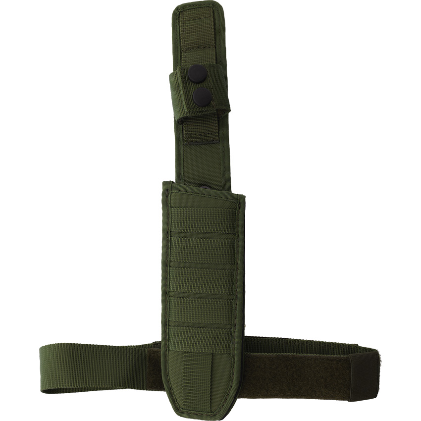 12″ (30.48cm) overall. 6.5″ (16.51cm) black MIL-C-13924 burnished flat ground Bohler N690 stainless tanto blade. Green G10 handle. Full, extended tang. Lanyard hole. Glass breaker pommel. Black Cordura MOLLE compatible belt sheath. Boxed.