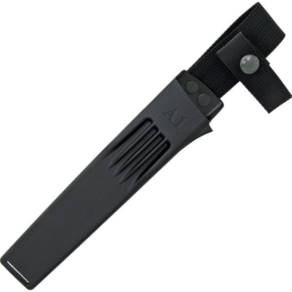11.13″ (28.27cm) overall. 6.38″ (16.21cm) black CeraCoat 8H coated laminate VG-10 stainless modified spear point blade. Black checkered Kraton handle. Full tang. Lanyard hole. Black nylon belt sheath.