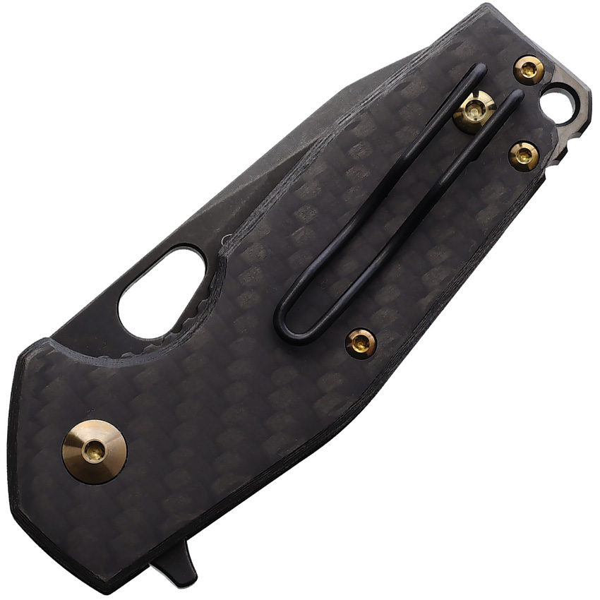 3.5″ (8.89cm) closed. 2.5″ (6.35cm) black stonewash finish M390 stainless blade. Carbon fiber handle. Thumb pull. Extended tang. Lanyard hole. Pocket clip. Black leather pouch. Designed by Jesper Voxnaes. Boxed.