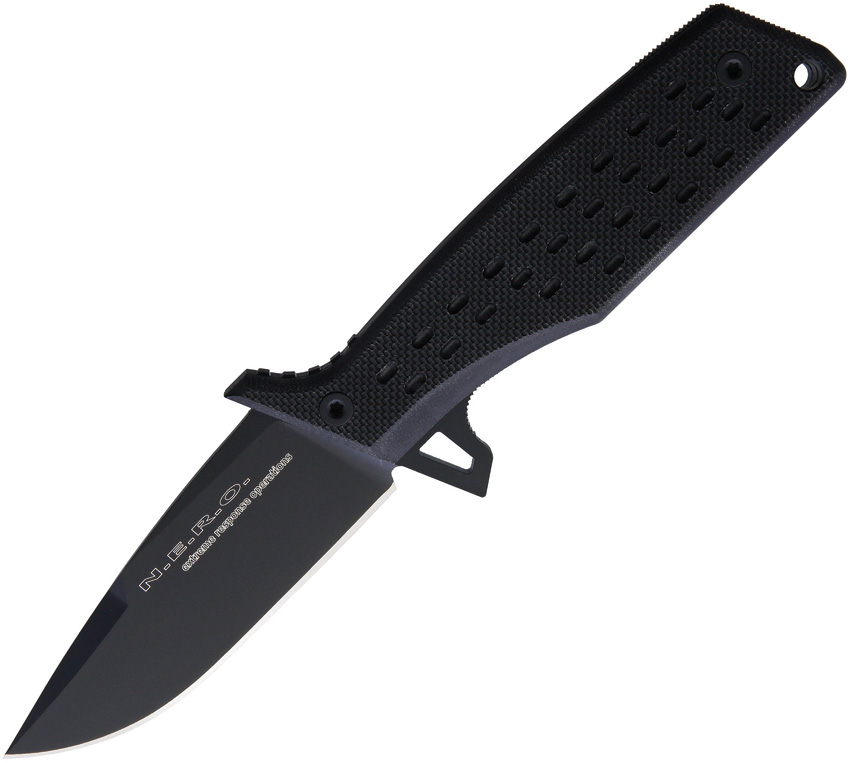 9.5″ (24.13cm) overall. 4.25″ (10.8cm) black Teflon coated Bohler N690 stainless blade. Black textured G10 handle. Full tang. Lanyard hole. Black nylon belt sheath. Boxed.