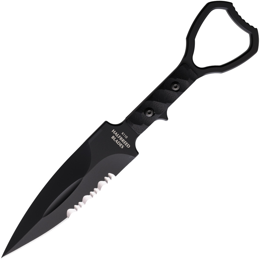 7.75″ (19.69cm) overall. 4″ (10.16cm) black Teflon coated partially serrated Bohler K110 stainless modified spear point blade. Black sculpted G10 handle. Full, extended tang. Finger ring. Black molded plastic MOLLE compatible belt sheath. Boxed.