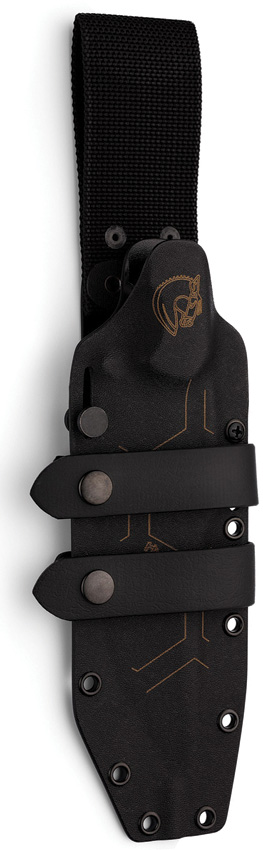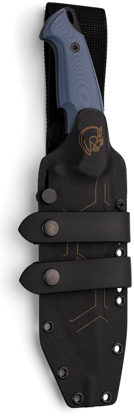 12.25″ (31.12cm) overall. 7.13″ (18.11cm) black powder coated Sleipner tool steel clip point blade. Blue G10 handle. Full, extended tang. Lanyard hole. Nylon belt loop with PVC soft rubber loop (Scout carry system). Black Kydex belt sheath. Boxed.