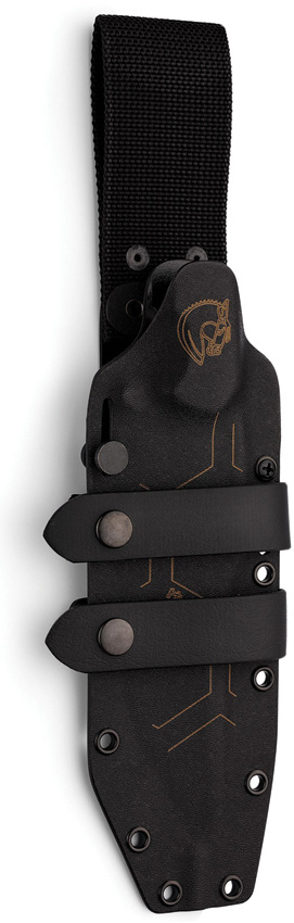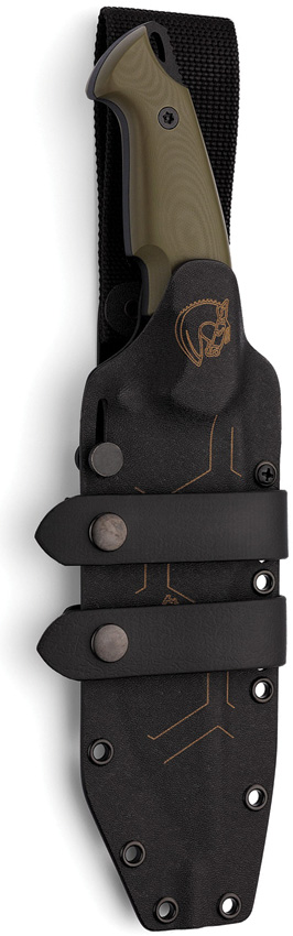 12.25″ (31.12cm) overall. 7.13″ (18.11cm) black powder coated Sleipner tool steel clip point blade. Green G10 handle. Full, extended tang. Lanyard hole. Nylon belt loop with PVC soft rubber loop (Scout carry system). Black Kydex belt sheath. Boxed.