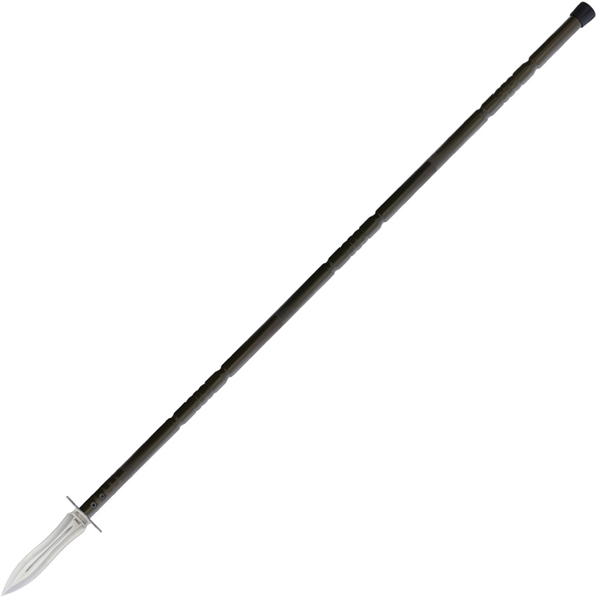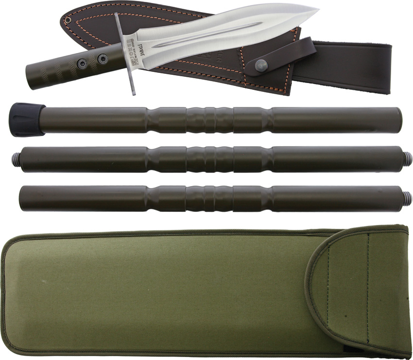 14.75″ (37.47cm) overall. 9.75″ (24.77cm) satin finish double edge 1.4116 stainless blade. OD green aluminum handle. Stainless guard. Handle comes in three pieces that screw together. 69″ overall length when fully assembled. Green nylon belt sheath. Boxed.