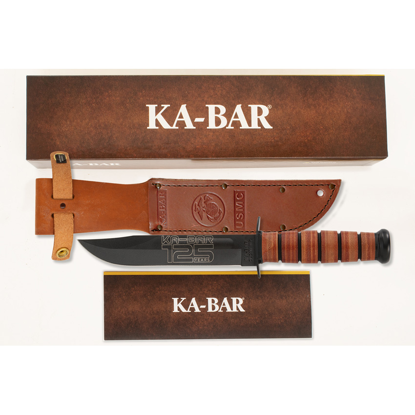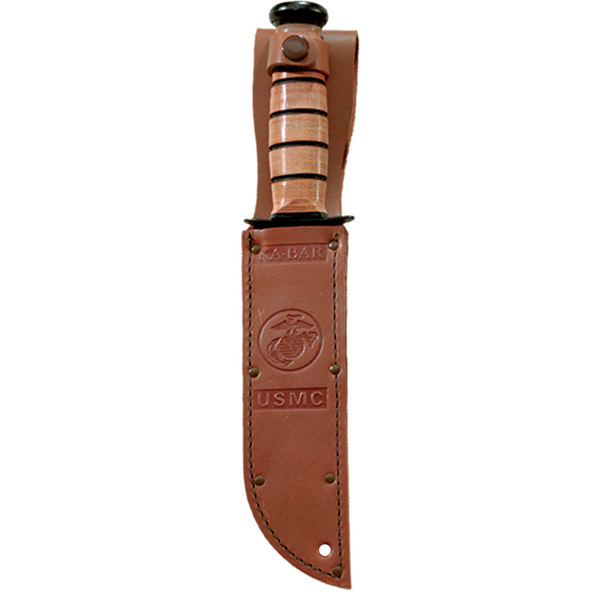 11.88″ (30.18cm) overall. 7″ (17.78cm) black oxide coated 1095 Cro-Van carbon steel clip point blade. Stacked leather handle. Steel guard and pommel. Blade etching. USMC blade stamp and sheath. Brown leather belt sheath. Boxed.