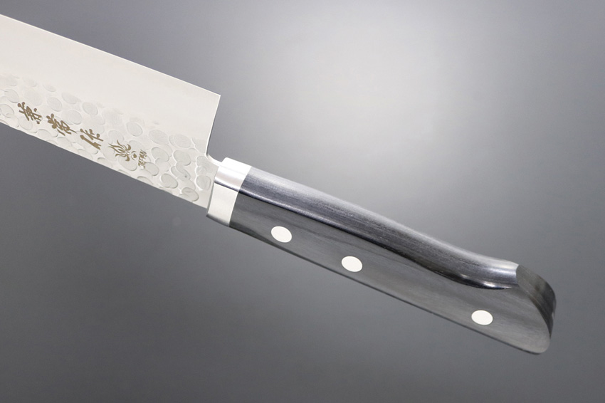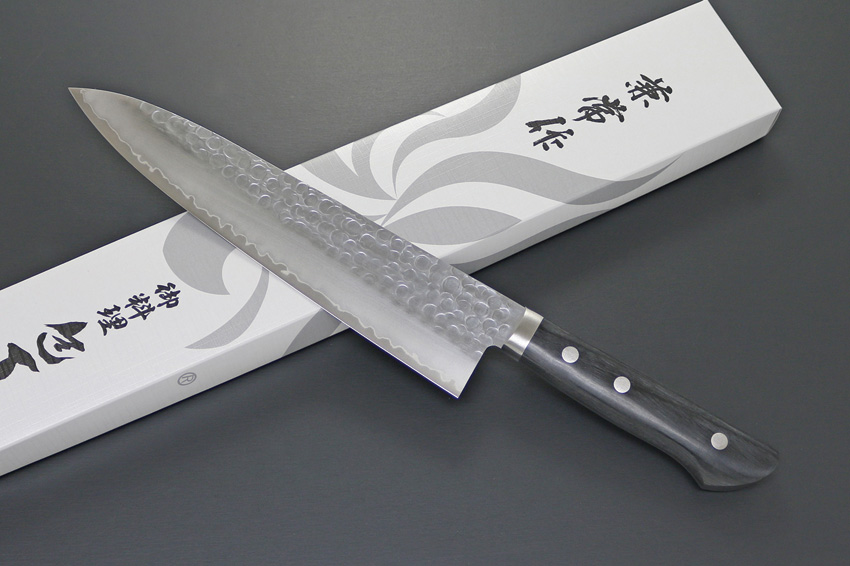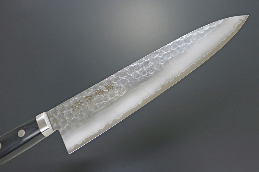 13.25″ (33.66cm) overall. 8.5″ (21.59cm) blade. Black wood handle. Hammered finish Hon-Warikomi clad blade made of VG-1 stainless core sandwiched by SUS410 stainless. Boxed.