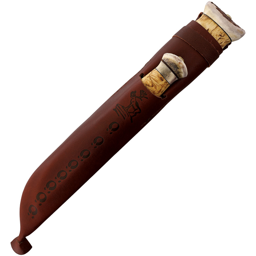 Carbon steel blade. Curly Birch handle. Reindeer horn pommel. Includes: 13.25″ overall fixed blade with 8.25″ blade; 7.75″ overall skinner with 3″ blade. Brown leather belt sheath. Bulk packed.