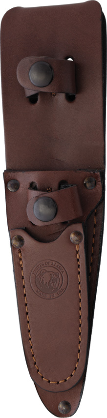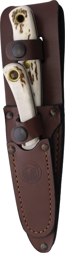 Bead blast finish MagnaCut steel blade. Stag handle. Full tang. Lanyard hole. Includes: 8″ overall alpha wolfe with 3″ blade; 6.5″ overall muskrat with 2.25″ blade with sharpened top edge. Brown leather belt sheath. Boxed.