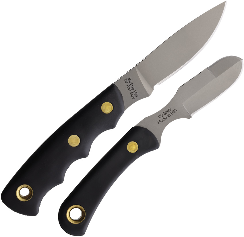 Bead blast finish D2 tool steel blade. Black SureGrip handle. Full tang. Lanyard hole. Includes: 8″ overall alpha wolfe with 3″ blade; 6.5″ overall muskrat with 2.25″ blade with sharpened top edge. Brown leather belt sheath. Boxed.