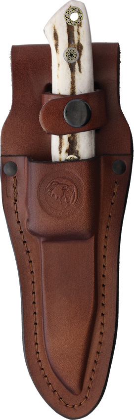 8″ (20.32cm) overall. 3.5″ (8.89cm) bead blast finish MagnaCut steel drop point blade. Stag handle. Nickel silver bolster(s). Full tang. Lanyard hole. Brown leather belt sheath. Boxed.
