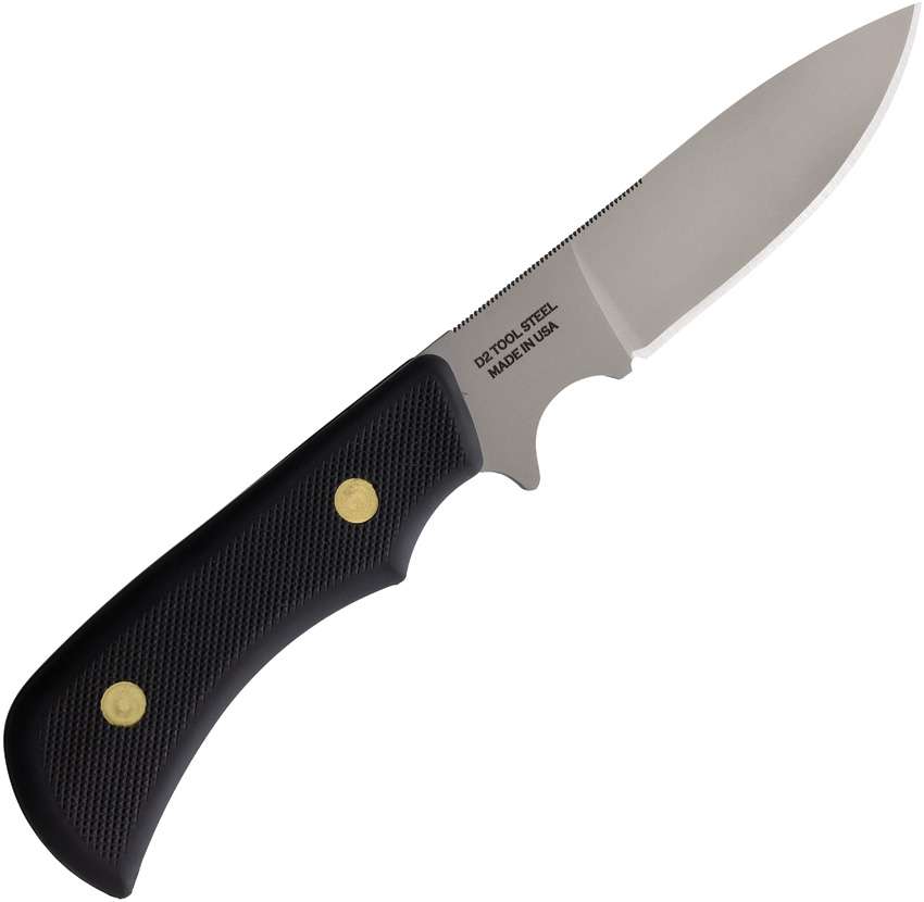 8.5″ (21.59cm) overall. 3.25″ (8.26cm) bead blast finish D2 tool steel blade. Black SureGrip handle. Full tang. Brown leather belt sheath. Boxed.
