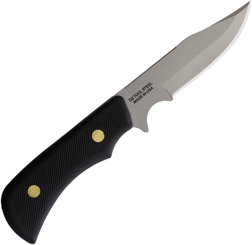 8.5″ (21.59cm) overall. 3.5″ (8.89cm) bead blast finish D2 tool steel clip point blade. Black SureGrip handle. Full tang. Brown leather belt sheath. Boxed.